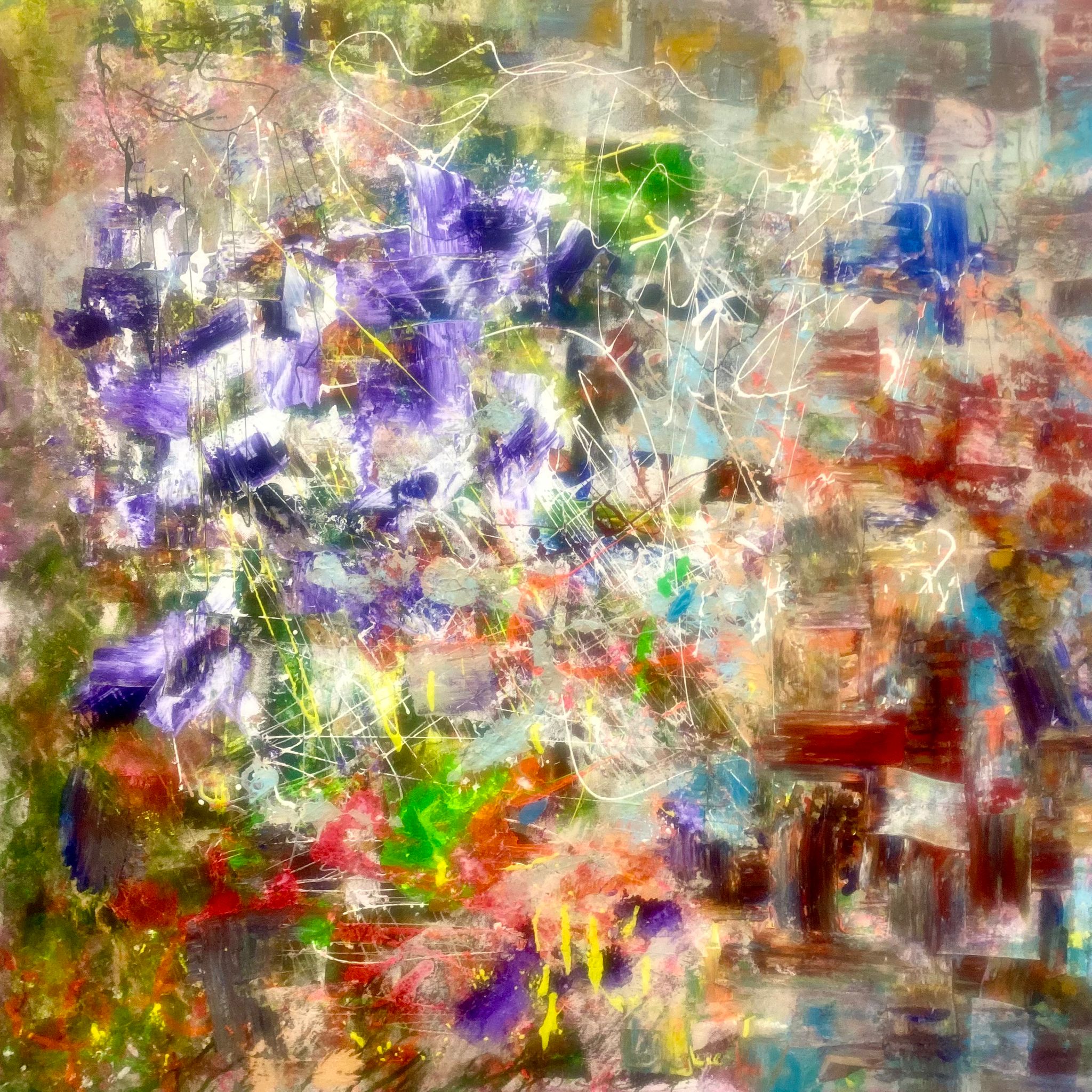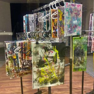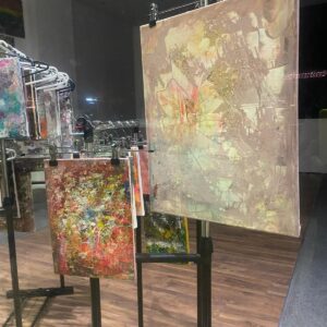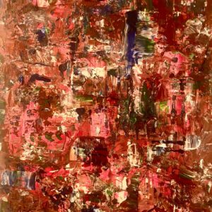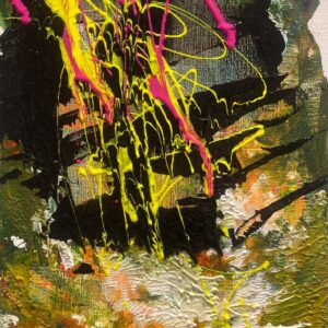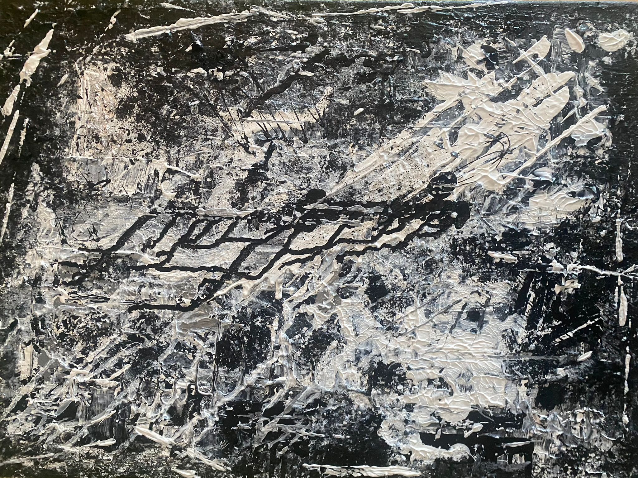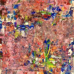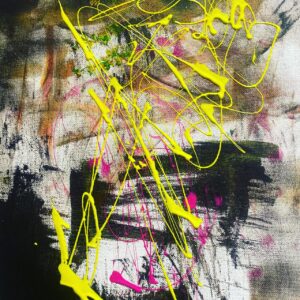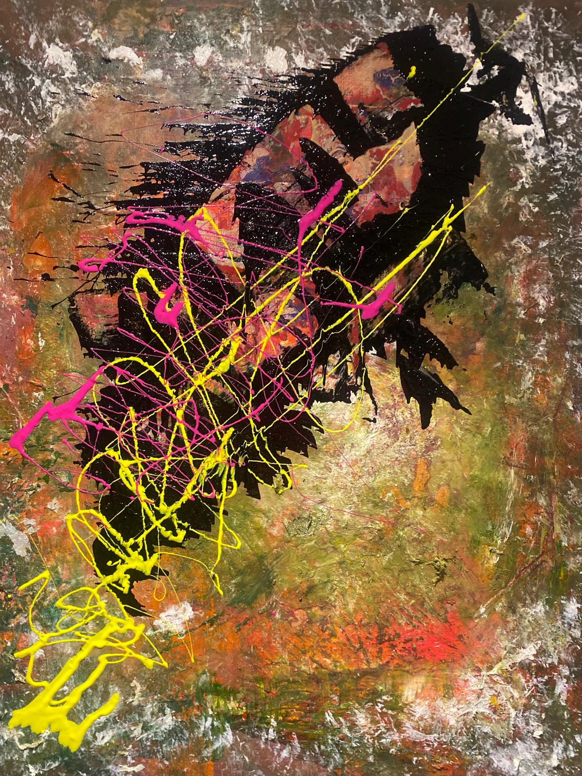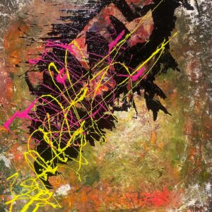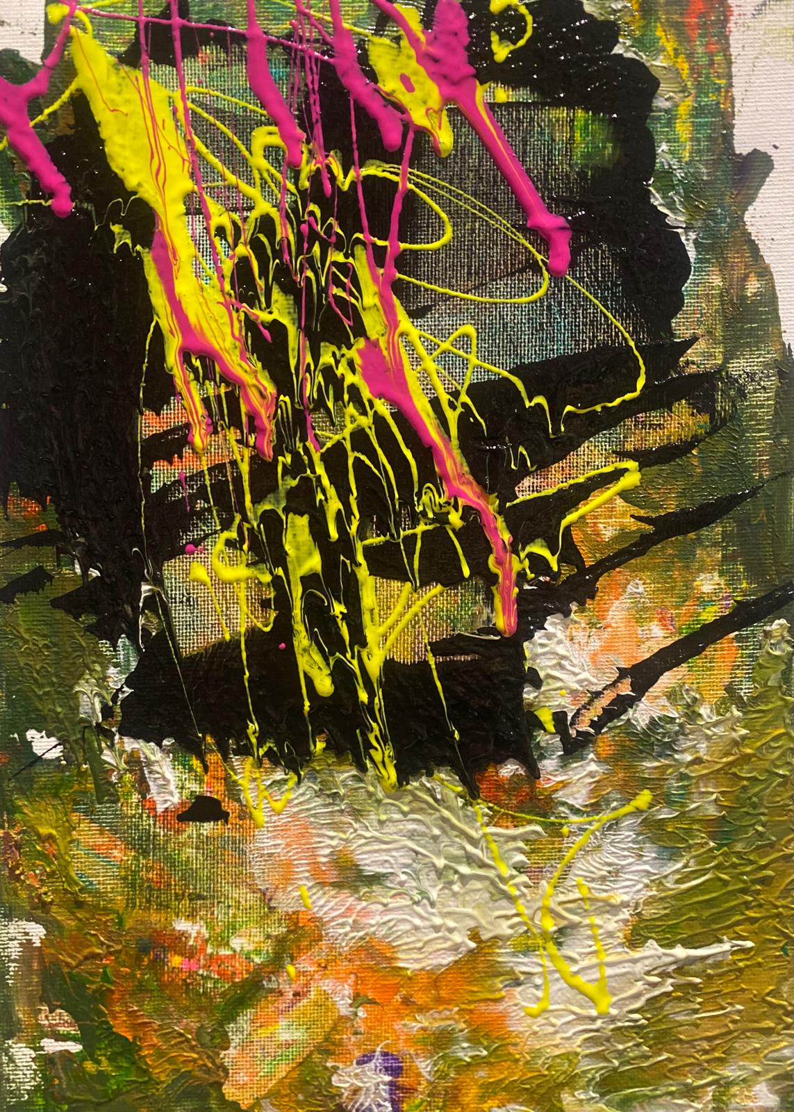 ‘I quickly discovered an unconventional artistic avenue by eschewing all brushes and using my technical hairdressing equipment and a vast array of kitchen and quirky home utensils as my instruments, Utilising their varied forms & textures on canvas’.‘By infusing my raw emotions and employing unconventional tools, I aim to polarise and evoke profound thoughts and feelings,using these unorthodox methods l orchestrate a combination of layers, textures and colours by blending opposing traditional artistic norms.,